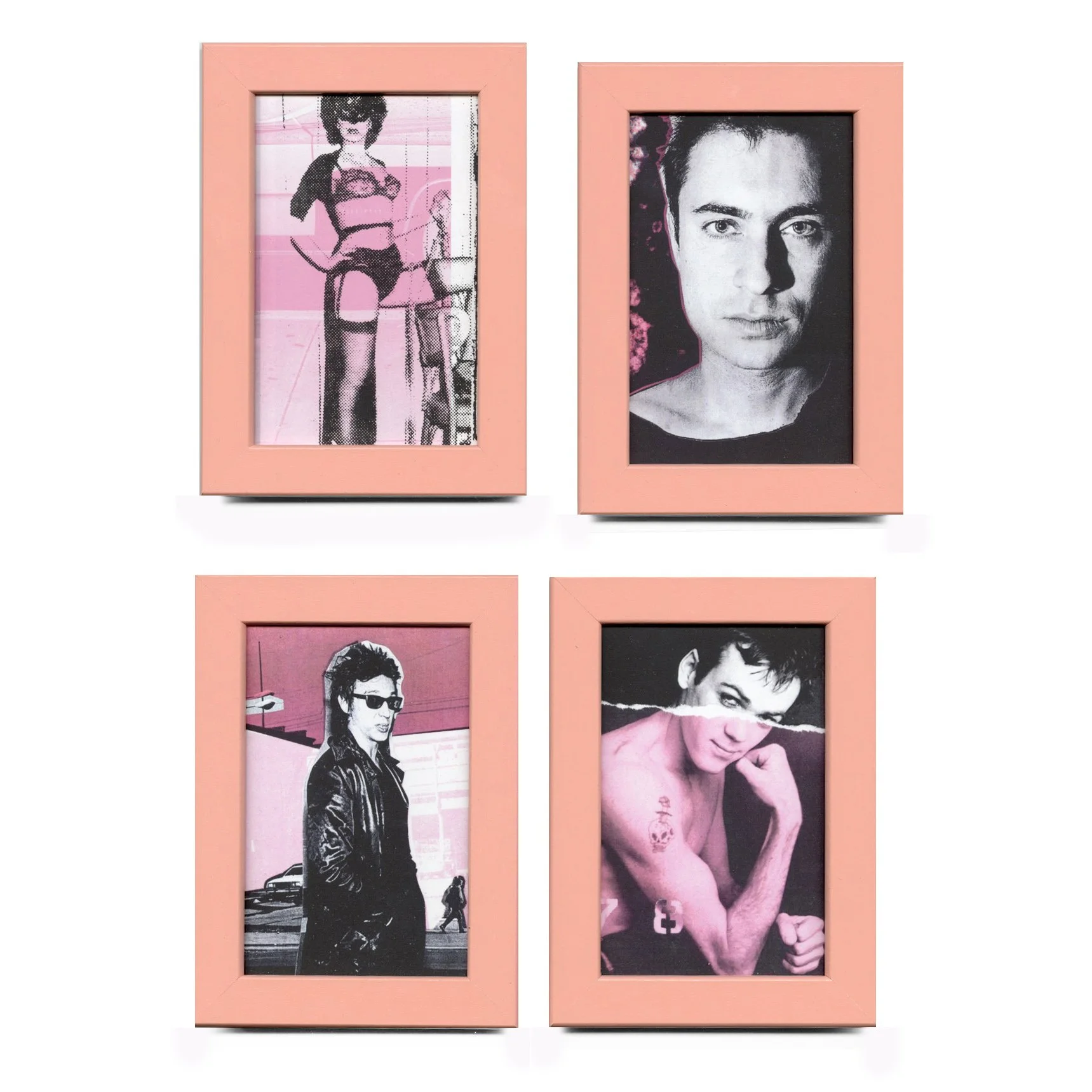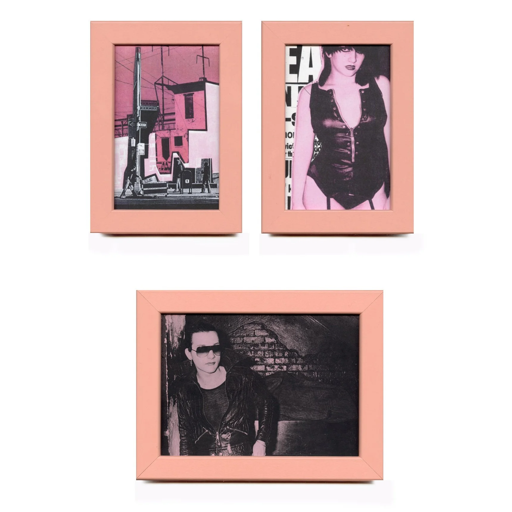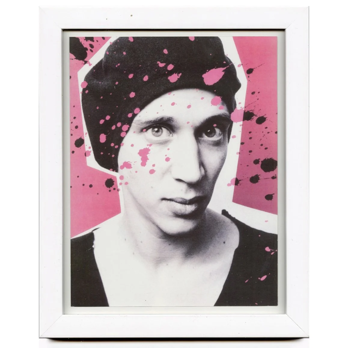 A colorful photo collage in pink and black of Brian James of The Damned at The Gramercy Park Hotel - page cut out of my TICKLED zine, placed in a peachy pink frame with acrylic “glass” - good to liven up a small corner in your space or as a gift for a special friend. COMES WITH BUTTONS SHOWN and a LABEL and signature on the back label